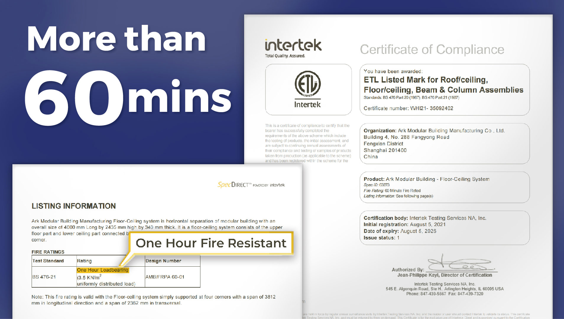 According to the BS476 standard test results, the fire protection time of the roof/floor chassis and wall panels of ARK products exceeds 60 minutes for the entire building.